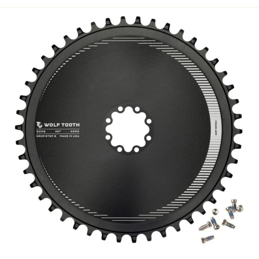 Designed for gravel and road racing, and for those looking to optimise every detail in pursuit of speed, Wolf Tooth Aero chainrings are strong, lightweight and profiled to fit seamlessly with your crankset for a clean, integrated look. Taking advantage of 1x drivetrain systems and wider-range rear cassettes, Aero chainrings are available in 46T to 52T sizes to offer a similar overall range to standard 2x drivetrain setups. They feature our patented Drop-Stop® design for optimal durability, chain retention and mud clearance. Drop-Stop B is optimised for SRAM Eagle and Flattop chains.